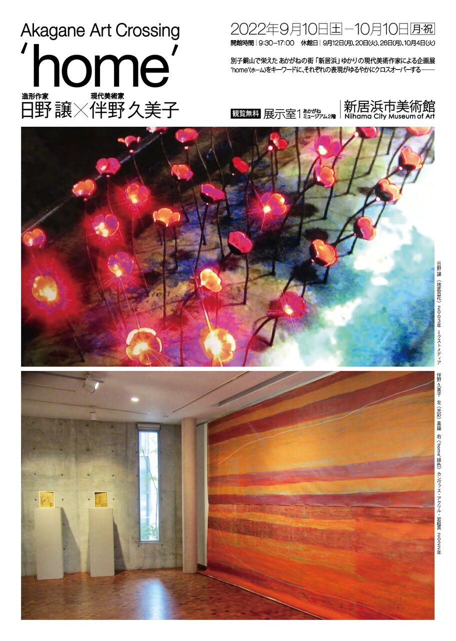 日野譲×伴野久美子『home』@新居浜市美術館 2022年09月09日 日野譲×伴野久美子『home』@新居浜市美術館別子銅山で栄えた銅(あかがね)の街「新居浜」にゆかりを持つ造形作家・日野 譲(ひの ゆずる)と、現代美術家・伴野 久美子(ばんの くみこ)の 2 名によるふたつの個展を開催します。‘home’(ホーム)という共通のキーワードをもとに、ゆるやかに関わりあう展示空間の中で、 両者の表現がどのようにクロスオーバー*していくのか注目。 ●会期 2022年9月10日(土)〜10月10日(月)9:30-17:00料金 無料●会場新居浜市美術館 展示室 1愛媛県新居浜市坂井町2丁目8-1Tel. 0897-65-3580 「愛媛」カテゴリの最新記事 タグ :#日野譲#伴野久美子#home#新居浜市美術館 < 前の記事次の記事 > コメント コメントフォーム 名前 コメント 評価する リセット リセット 顔 星 投稿する 情報を記憶